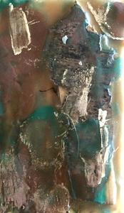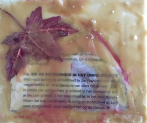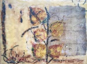 2022Schilderen met bijenwas! Laagje voor laagje verwarmen en er iets in achterlaten. Een kopie van een hele oude acte uit de familie, blaadjes, oliepastel, olieverf, bessensap. Waarvan acte!