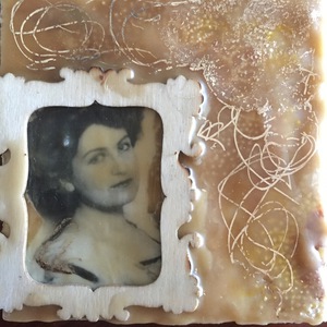 2022Bijenwas, een fotootje uit een tijdschrift, met een link naar een ooit gekregen boek, een houten embellishment. Voor Ton.